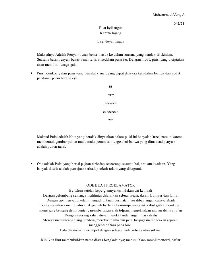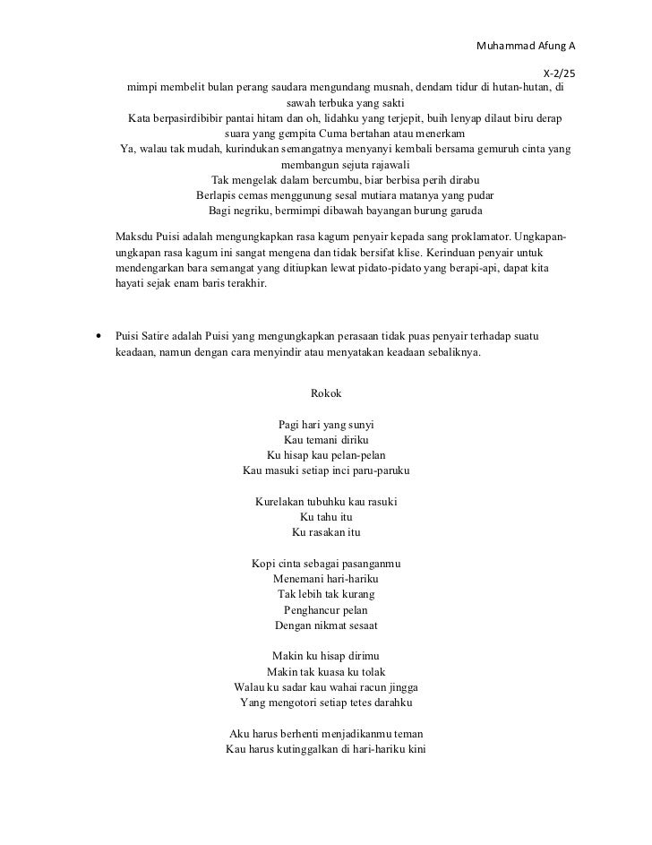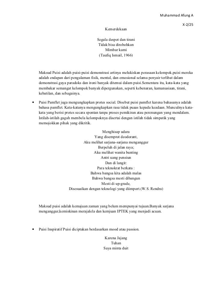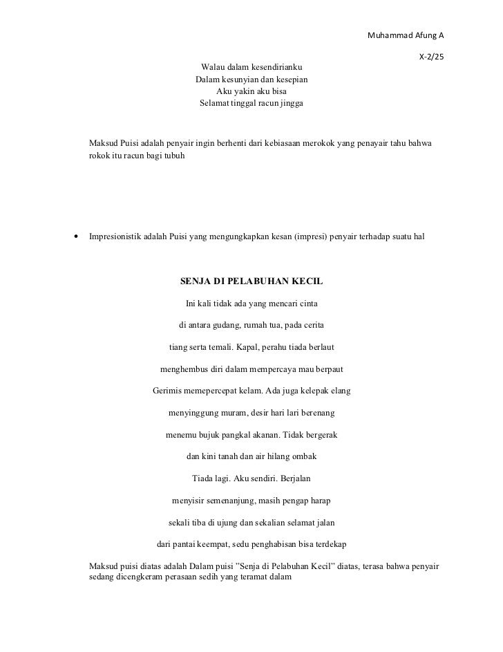 Anda bisa mendownload atau mencetak gambar atau foto Contoh Puisi Impresionistik di bawah ini. Puisi kritik sosial adalah puisi yang juga menyatakan ketidaksenangan penyair terhadap keadaan atau terhadap diri seseorang namun dengan cara membeberkan kepincangan atau ketidakberesan keadaan. Yang kuperhatikan adalah bapak parkir motor supermarket B tersebut.