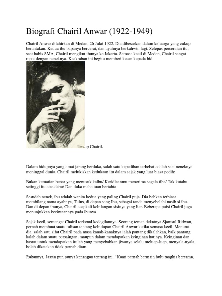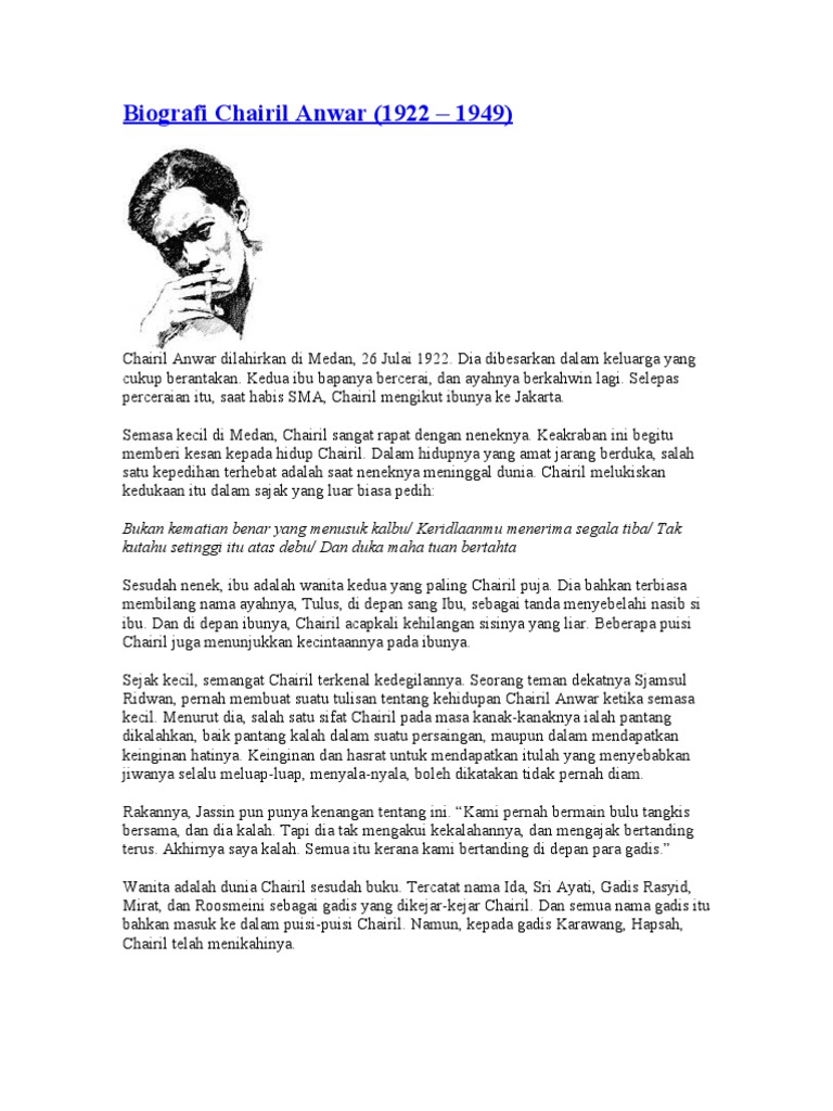 Puisi Chairil Anwar yang berjudul Karawang Bekasi ini menggambarkan tentang kemerdekaan yang sulit untuk dipertahankan. Semasa kecil di Medan Chairil Anwar sangat dekat dengan neneknya. Chairil Anwar Sebuah Pertemuan Penulis.