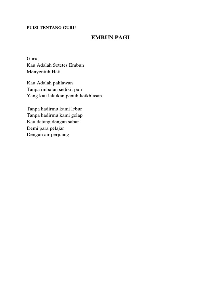 Feb 28 2021 Contoh puisi guru berjudul maafkanlah ini dapat memberikan Anda sedikit suntikan untuk lebih menghargai guru sebagai sosok yang penting bagi hidup kita.
